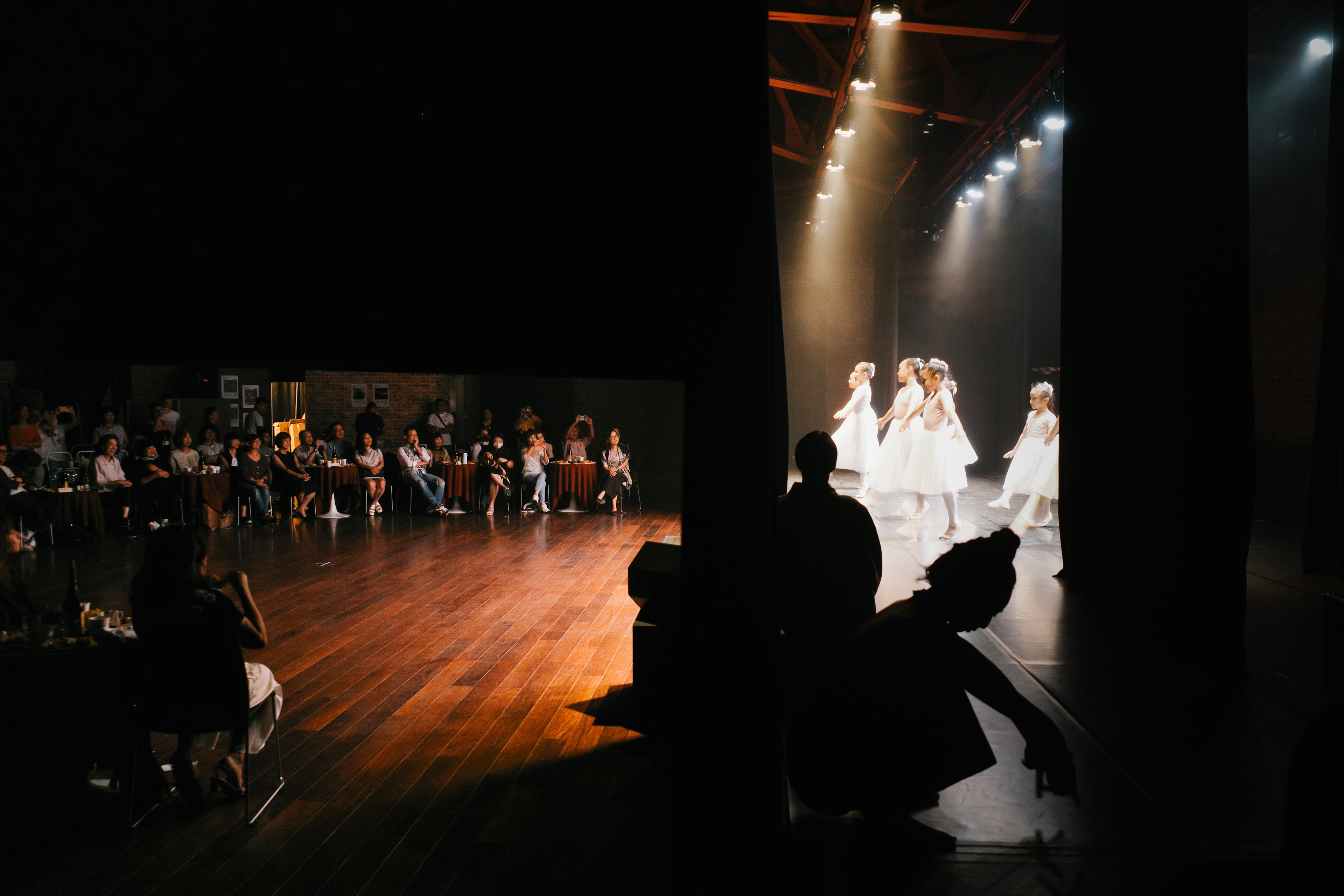 2024年8月17日,精靈幻舞舞團舉行《赤腳與高跟鞋》感恩募款演出。來自南澳「播種夢想舞蹈空間」的孩子們經由多年的訓練後,首次站上正式舞台。照片透過布幕捕捉三重視角:台下觀眾的支持、舞台中央的演出,以及與幕後老師的守候。畫面定格於夢想啟航的瞬間,也呈現一幅關於成長、期待與支持的溫暖畫面。
